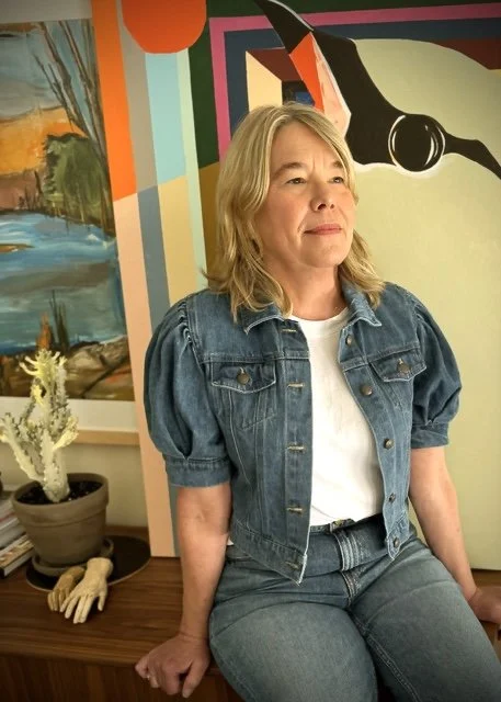 Sarah creates paintings, mixed media, and digital art rooted in the Southwest. Her work invites viewers into vibrant spaces that encourage a roving eye, and her earliest art memories are of western art. She tends to hang her hat on color, which she uses to generate rhythm and moods. Working from life and from photographic references, she explores the often-prickly intersection of the everyday and her urban/suburban surroundings. The streamlined shapes and curves come from a longtime crush on art deco architecture and design. She’s also repurposed seemingly innocuous motifs – hammers, rabbits, and birds – to address darker themes of violence, aggression, and anxiety. Her current work represents human connection through figures that are merged or intertwined – with other people, with animals, and with fragments of themselves. These pieces are intended to investigate themes of self-protection, empathy, and companionship.
